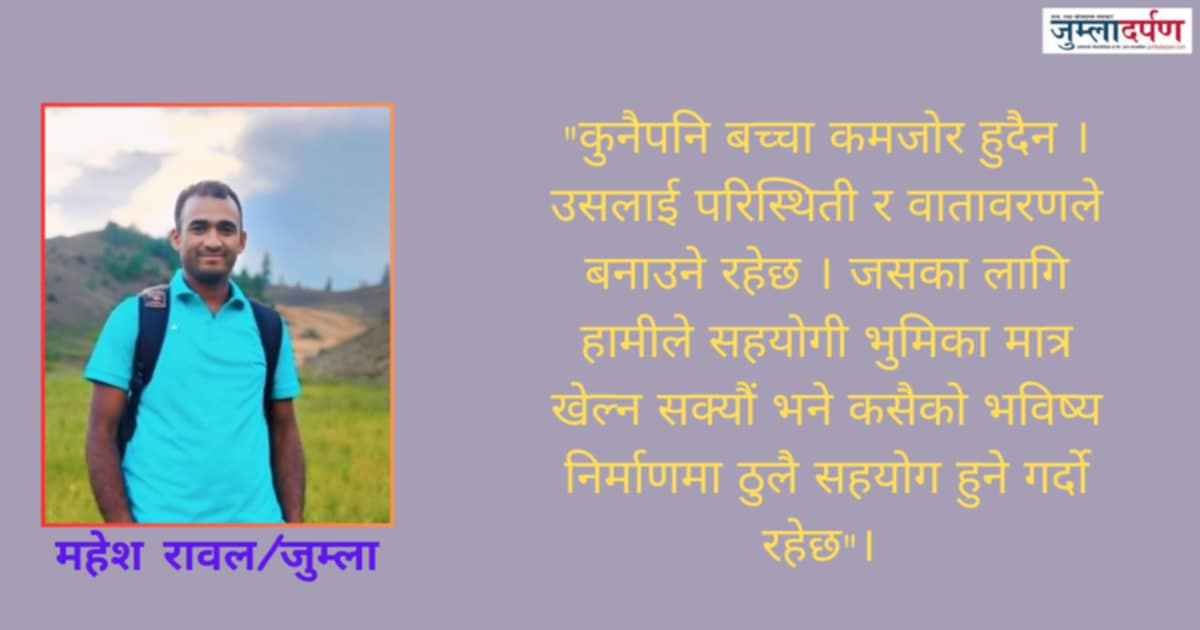अतः कुनैपनि बच्चा कमजोर हुदैन । उसलाई परिस्थिती र वातावरणले बनाउने रहेछ । जसका लागि हामीले सहयोगी भुमिका मात्र खेल्न सक्यौं भने कसैको भविष्य निर्माणमा ठुलै सहयोग हुने गर्दो रहेछ ।