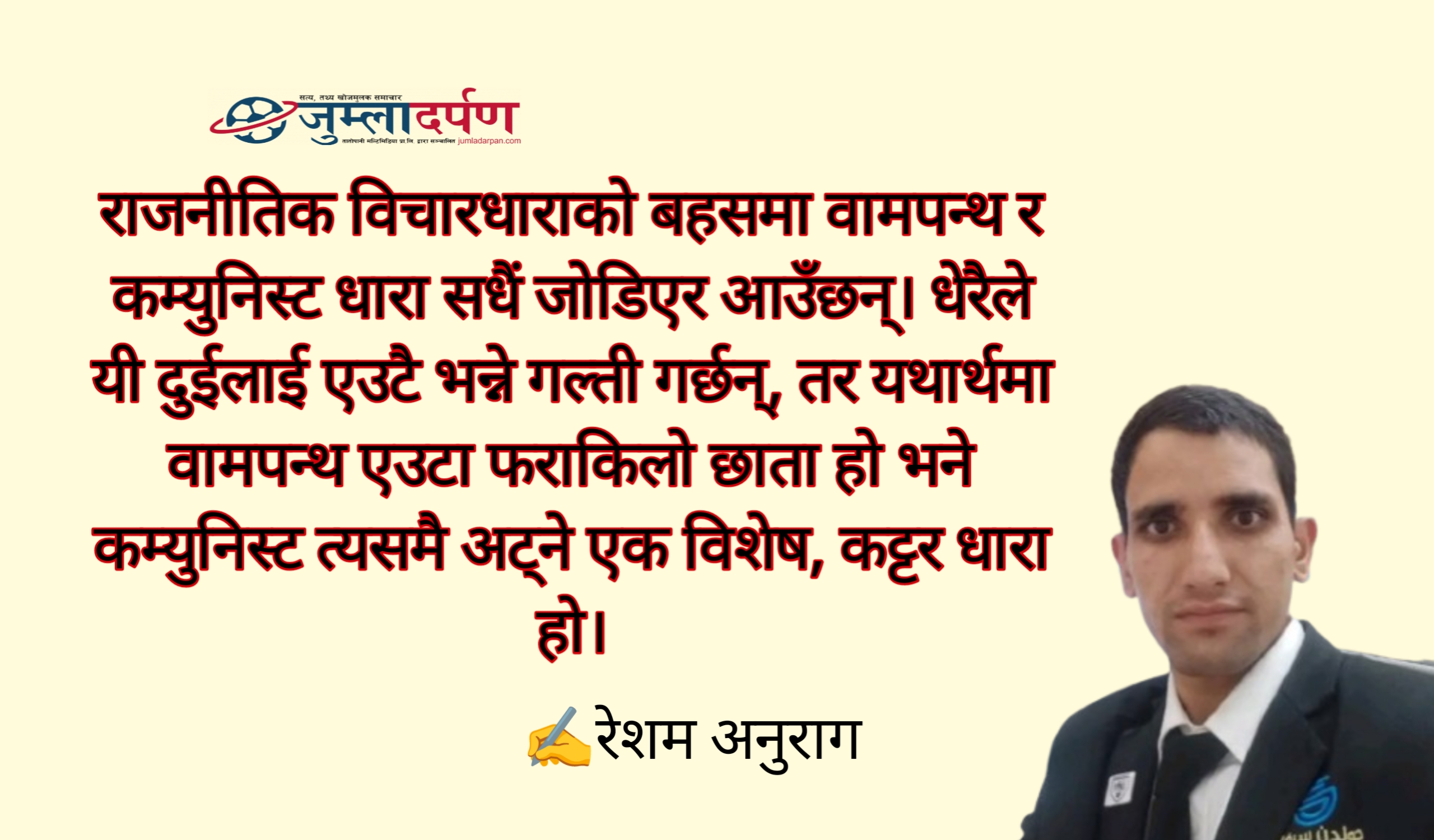 राजनीतिक विचारधाराको बहसमा वामपन्थ र कम्युनिस्ट धारा सधैं जोडिएर आउँछन्। धेरैले यी दुईलाई एउटै भन्ने गल्ती गर्छन्, तर यथार्थमा वामपन्थ एउटा फराकिलो छाता हो भने कम्युनिस्ट त्यसमै अट्ने एक विशेष, कट्टर धारा हो। वामपन्थ भन्नाले समानता, सामाजिक न्याय, श्रमिक–किसानको अधिकार, राज्यको सक्रिय भूमिका र प्रगतिशील मूल्यलाई बुझिन्छ। यस छातामुनि समाजवादी, सामाजिक लोकतान्त्रिक, प्रगतिशील वा हरित धारहरू पनि अट्छन्। तर कम्युनिस्ट धार वामपन्थकै कट्टर रूप हो, जसले निजी सम्पत्तिको उन्मूलन, उत्पादनका साधनहरूको सामूहिक स्वामित्व र अन्ततः वर्गविहीन समाज निर्माणलाई अन्तिम लक्ष्य मान्छ।