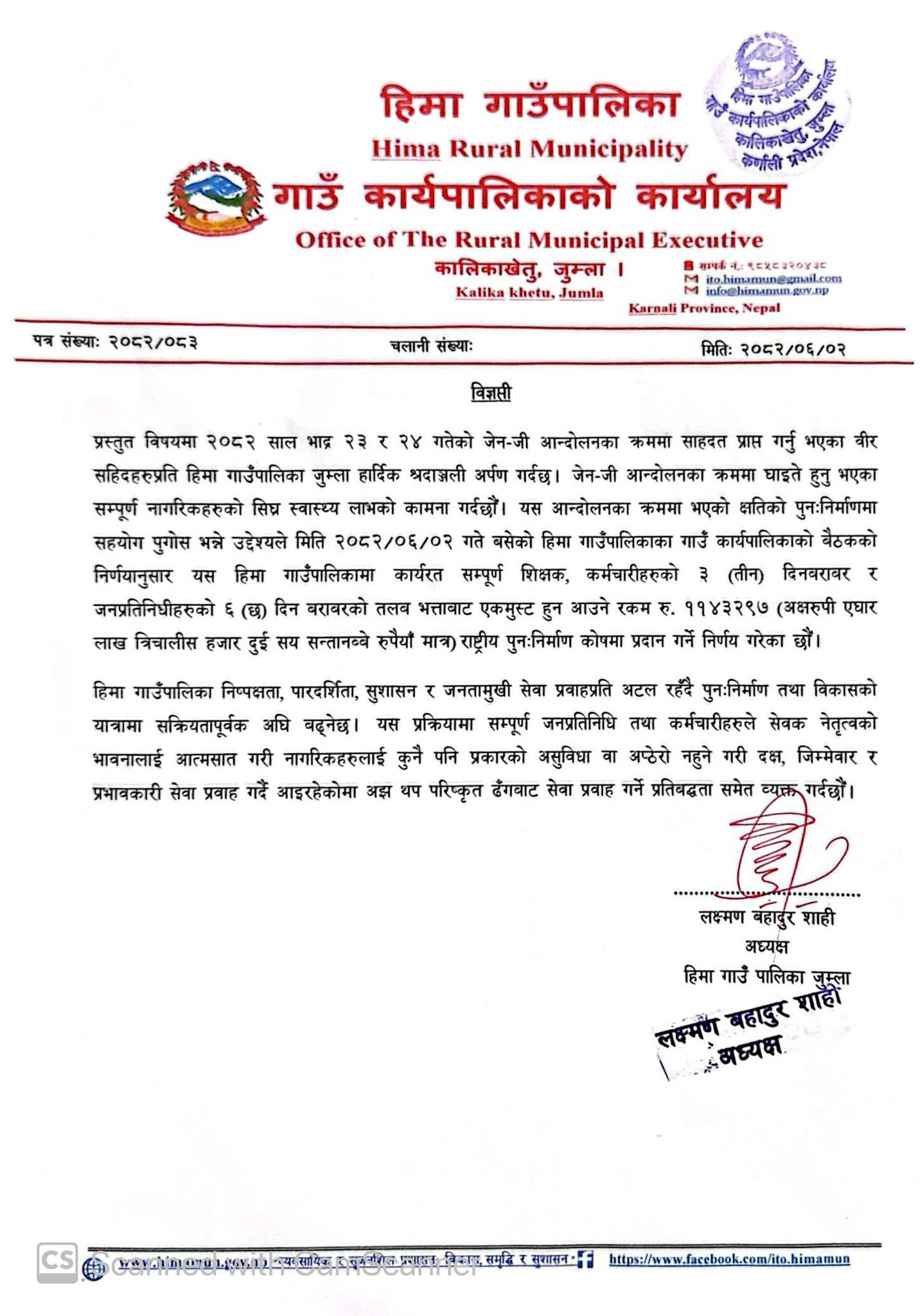 गत भदौ २३ र २४ गतेको आन्दोलनका क्रममा भएको क्षतिको पुनर्निर्माणमा सहयोग पुगोस् भन्ने हेतुले कर्मचारी र जनप्रतिनिधिको तलब भत्ताबापतको यो रकम कोषमा जम्मा गर्न लागिएको अध्यक्ष शाहीले बताए ।