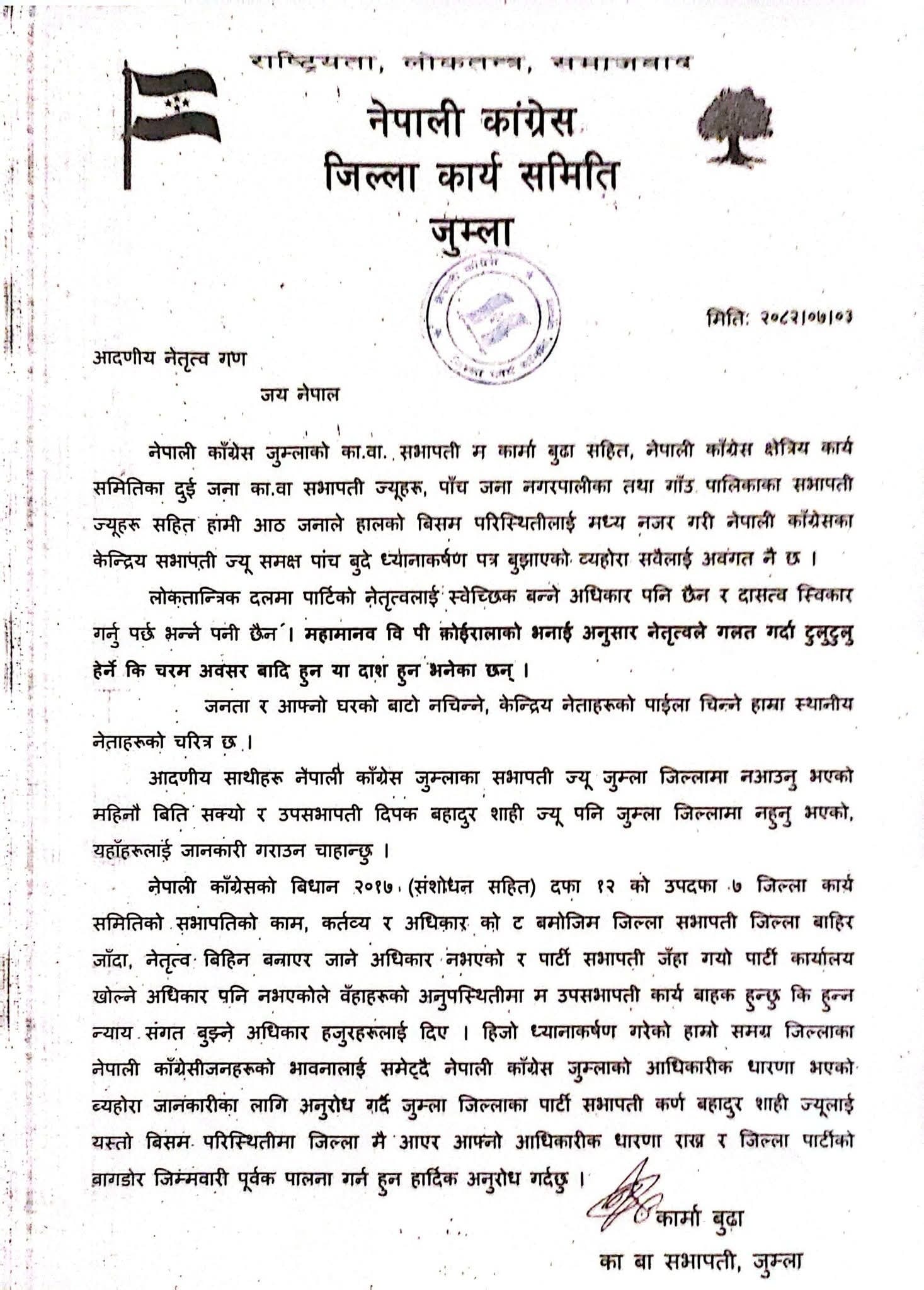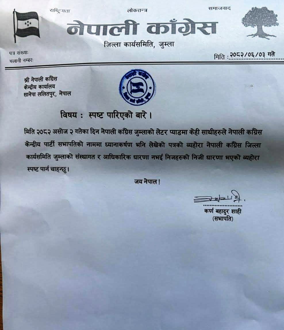 पार्टीकै लेटर प्याडमा सभापति शाहीको दस्तखतसहित स्पष्ट पारिएको भन्नेबारे भनेर सार्वजनिक पत्रमॉ २०८२ असोज २ गतेका दिन नेपाली कांग्रेसको लेटर प्याडमा केही साथीहरुले नेपाली कांग्रेस केन्द्रीय सभापतिको नाममा ध्यानाकर्षण भएको भनी लेखेको पत्रको व्यहोरा नेपाली कांग्रेस जिल्ला कार्यसमिति जुम्लाको संस्थागत र आधिकारिक धारणा नभई निजहरुको व्यक्तिगत धारणा नभएको स्पष्ट गर्न चाहन्छु’ भन्ने उल्लेख गरिएको छ ।