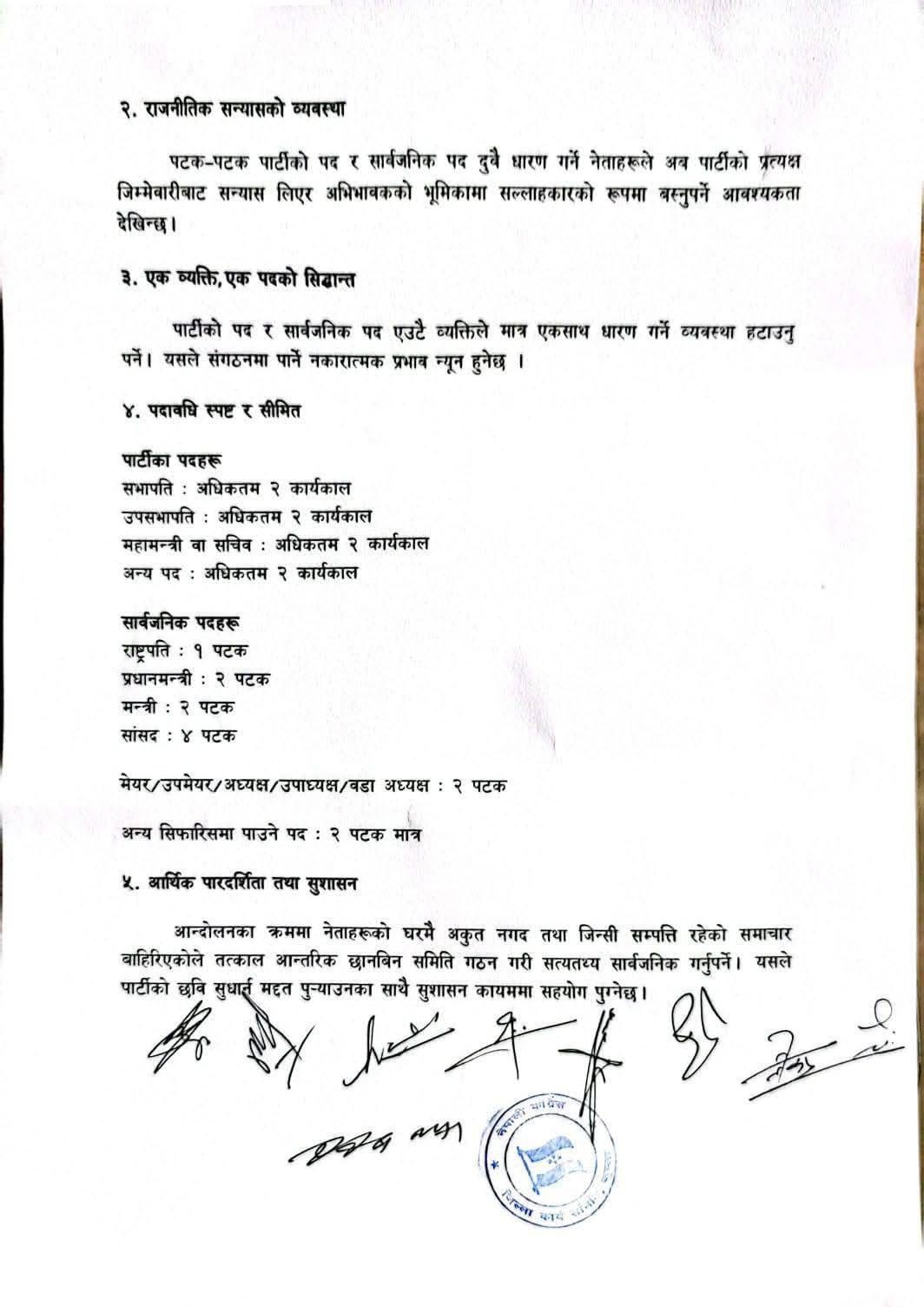 कार्यबाहक उपसभापतिसहित आठ जनाले नेताहरुले तत्काल विशेष महाधिवेशन वा महाधिवेशन सम्पन्न गरी फागुन २१ गते तोकिएको निर्वाचनमा भाग लिनुपर्ने र प्रधानमन्त्रीको उम्मेदवार तोकेरै चुनावमा सरिक हुनुपर्ने माग गरेका हुन् । उनीहरुले घुमाउरो रुपमा नेपाली कांग्रेसका वर्तमान सभापति शेरबहादुर देउवाको नेतृत्वमा चुनावमा जान नहुने संकेत गरेका छन् । यतिमात्रै होइन,‘राजनीतिक सन्यासको व्यवस्था’ शीर्षकमा पटकपटक पार्टीको पद र सार्वजनिक पद दुवै धारण गर्ने नेताले अब पार्टीको प्रत्यक्ष जिम्मेवारीबाट सन्यास लिएर अभिभावकीय जिम्मेवारीमा बस्नुपर्ने आवश्यकता देखिएको उल्लेख छ ।