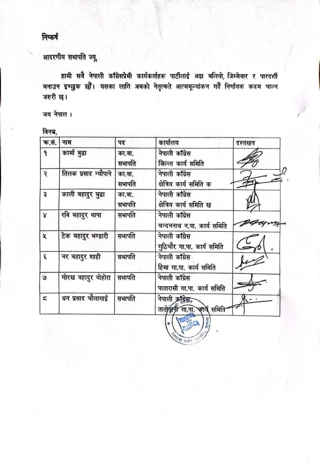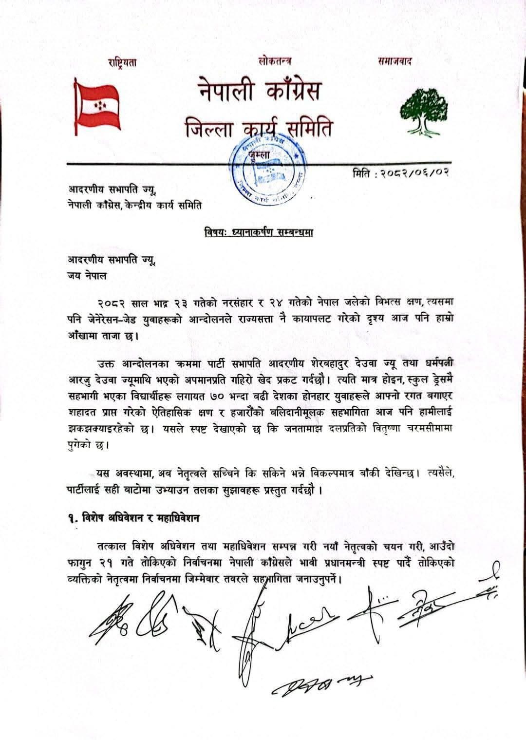 विहीबार दिउँसो नेपाली कांग्रेस जिल्ला कार्य समिति जुम्लाको लेटर प्याडमा एउटा ध्यानाकर्षण पत्र सार्वजनिक भयो । नाम उल्लेख नगरी नेपाली कांग्रेसका सभापति शेरबहादुर देउवालाई सम्बोधन गरेर सार्वजनिक गरिएको पत्रमा महत्वपूर्ण र पार्टी जीवनका लागि गम्भीर पाँच वटा विषय समावेश गरिएको छ । जसमा नेपाली कांग्रेसमा विशेष महाधिवेशन र महाधिवेशन माग गरिएको छ । विधानत नेपाली कांग्रेसको हालको केन्द्रिय कार्यसमितिको कार्यकाल २०८२ मंसिरसम्म मात्रै छ । नेपाली कांग्रेसको विधान अनुसार एक वर्ष महाधिवेशन सार्न सकिने अवस्था छ ।